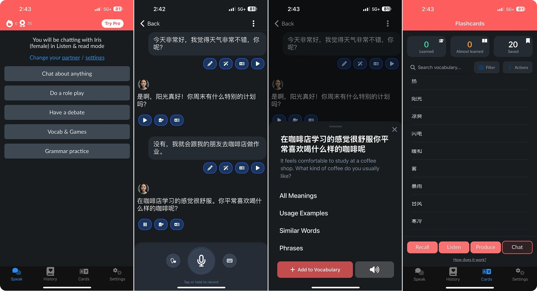 Integrated Vocabulary Support: As you practice, new vocabulary is captured and turned into flashcards for ongoing review and reinforcement.