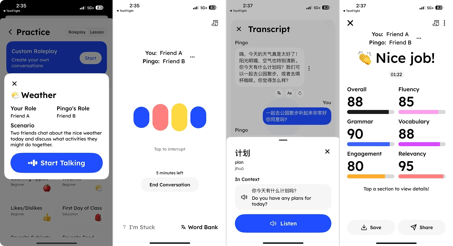 Roleplay Mode: Practice real-life Chinese conversations such as ordering food, asking for directions, or casual chatting. Receive instant corrections and actionable feedback after each session to continuously strengthen your skills. Pingo AI can even use specific accents from different regions in China!