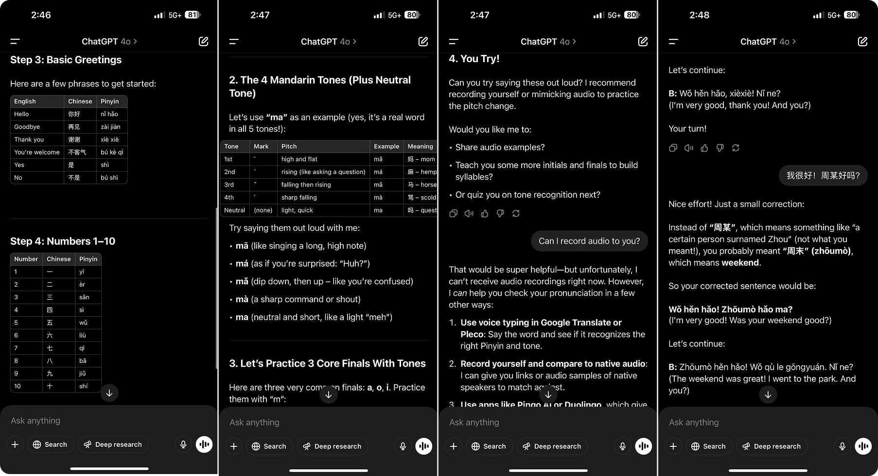 Tutor Mode: Focus on learning essential grammar, vocabulary, and pronunciation from the ground up. This mode is ideal for beginners or anyone brushing up on Chinese fundamentals, or wanting to learn a new topic from scratch. Combined with Roleplay Mode, it offers a full-skill development experience.