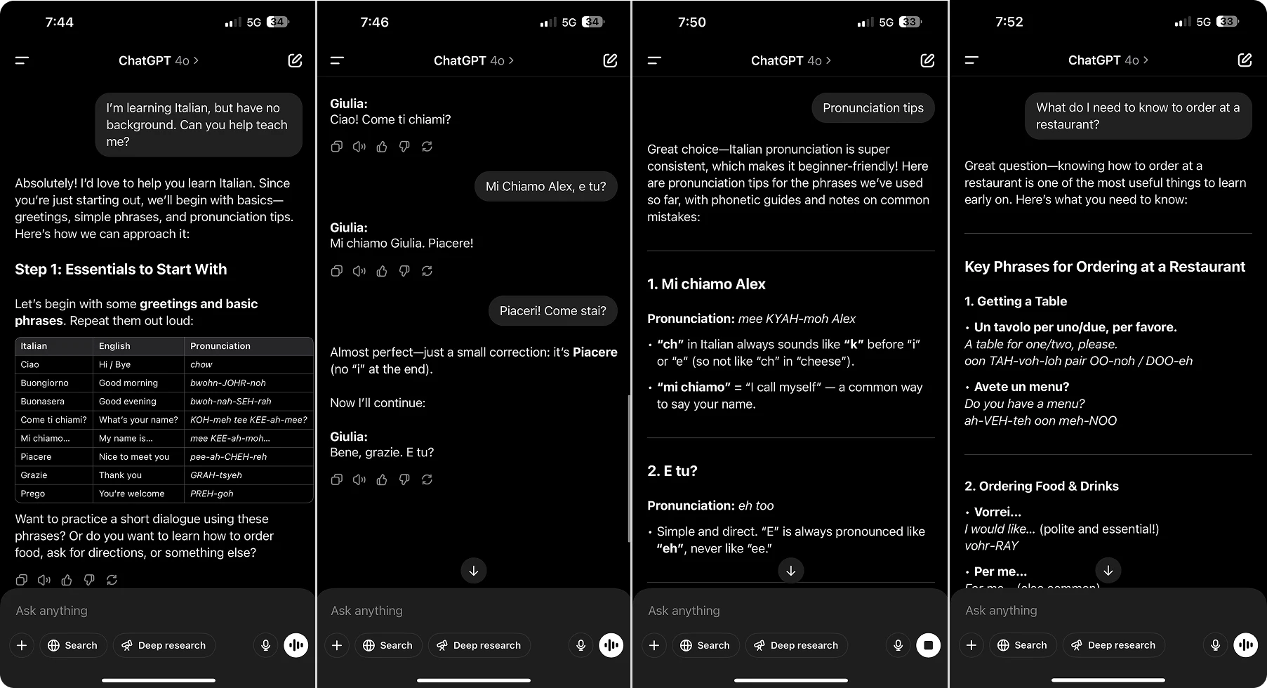 Flexible Practice: With the right prompts, ChatGPT lets you practice both written and spoken (using Voice Mode) Italian conversations, making it convenient for anyone wanting to learn on their own schedule. However, beginners should be cautious—it often speaks too fast and asks too many questions.
