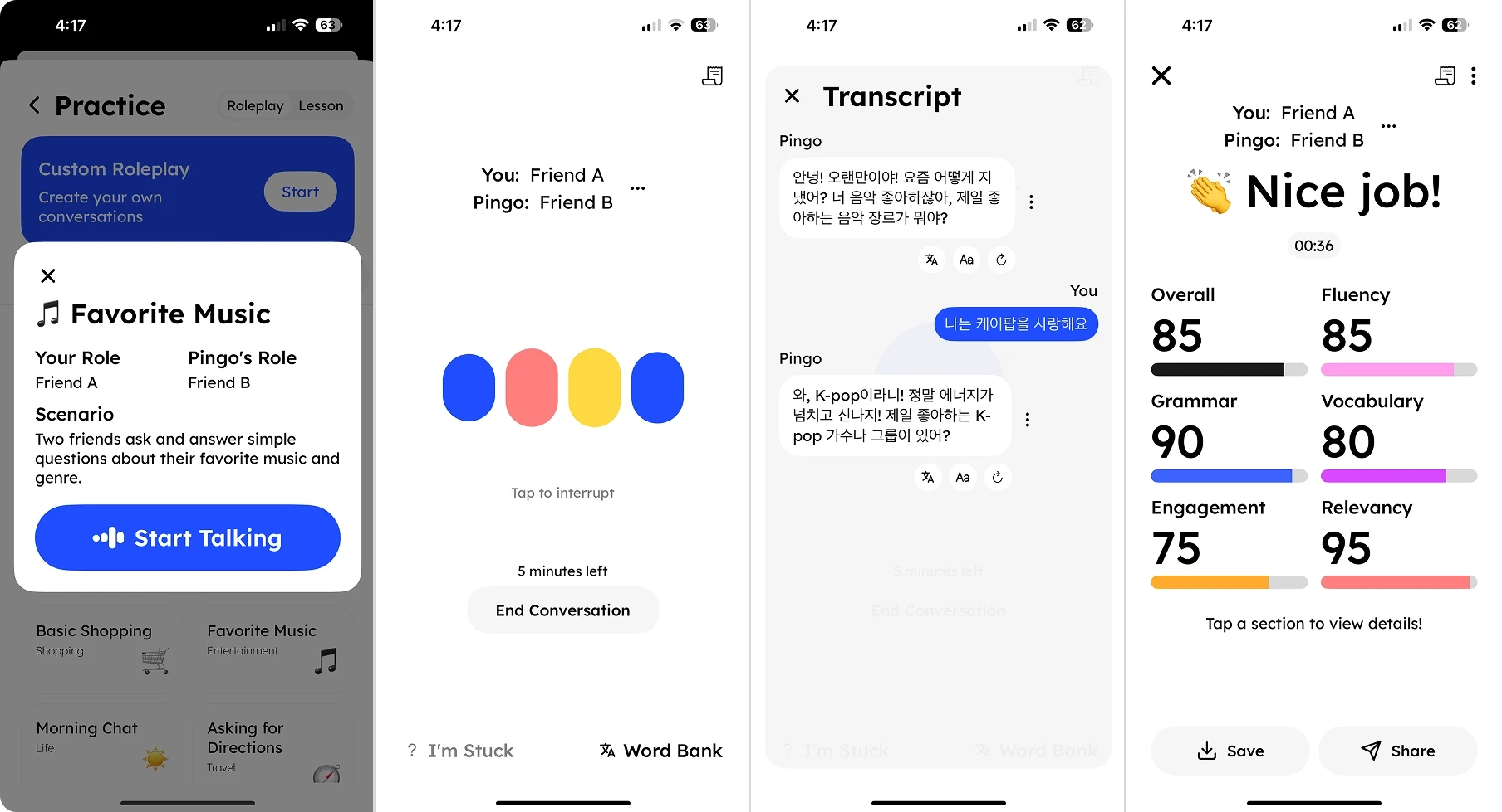 Pingo AI is our top pick for the best AI Korean tutor and overall AI language learning app. It offers immersive AI conversations designed to mirror real-life situations, with detailed, level-based feedback.