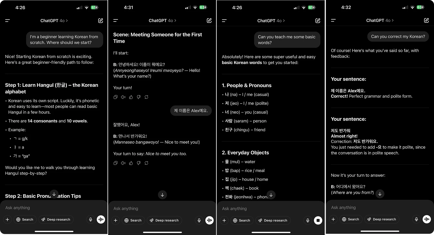 Highly Customizable: You can prompt ChatGPT to roleplay, translate Korean, or quiz you on vocabulary.