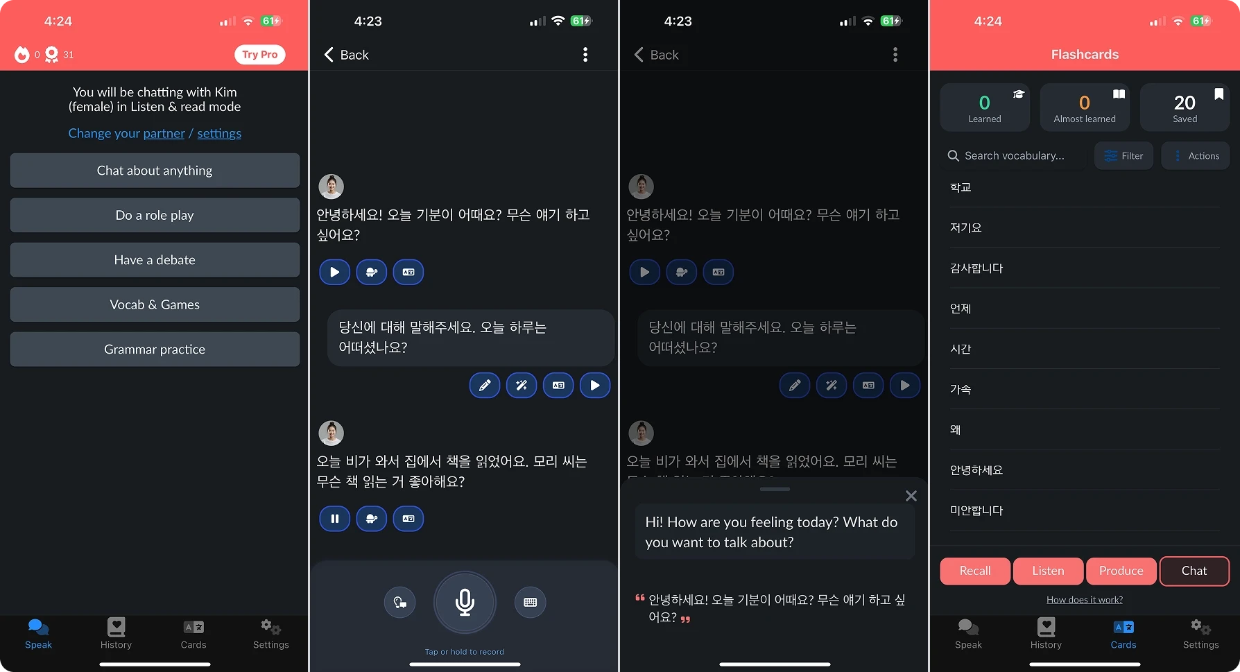 Tutor Mode: Learn new Korean grammar, vocabulary, and pronunciation from scratch or build on what you already know. Ideal for structured improvement.