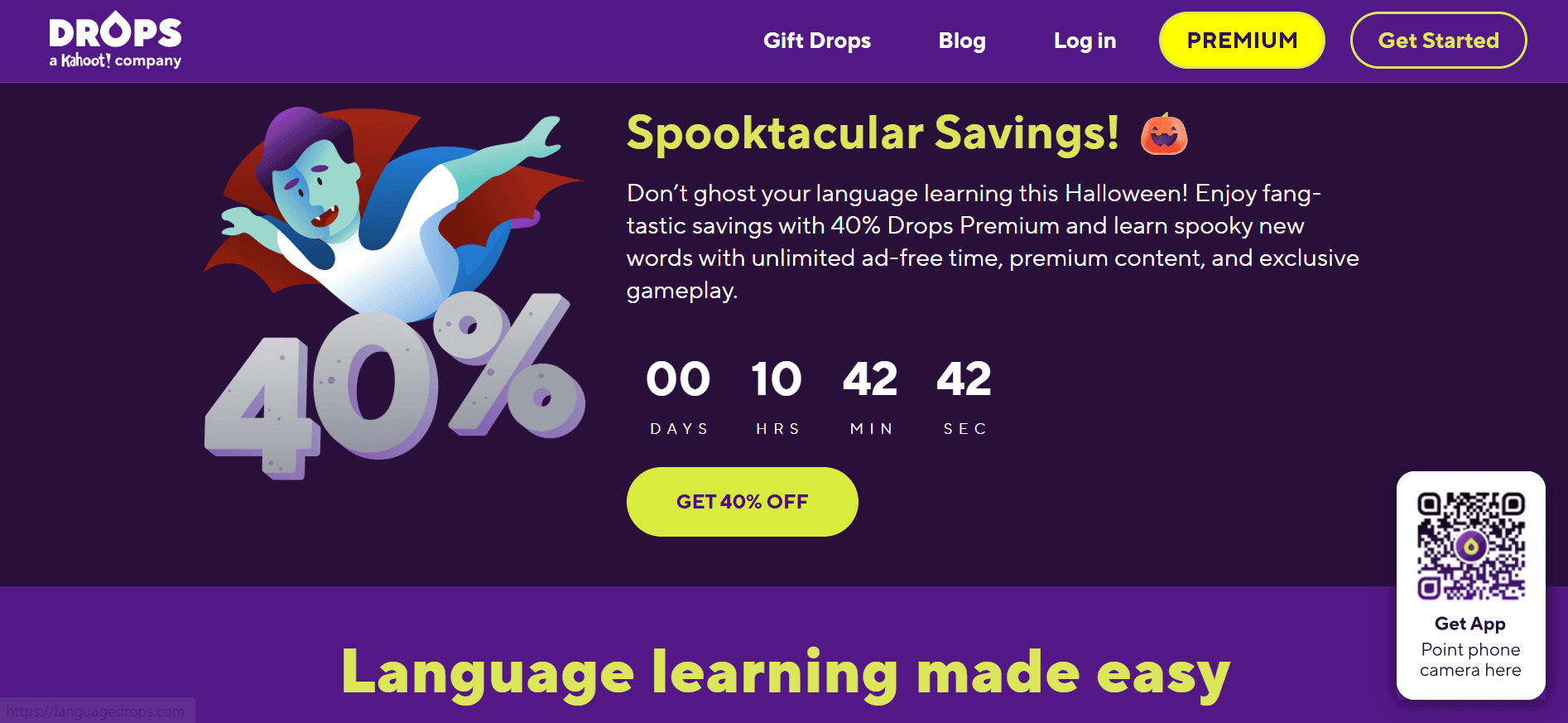 Drops teaches vocabulary through short, game-like sessions that use curated word lists and custom illustrations to aid recall. The interface rewards progress and tracks your streaks to keep motivation high.